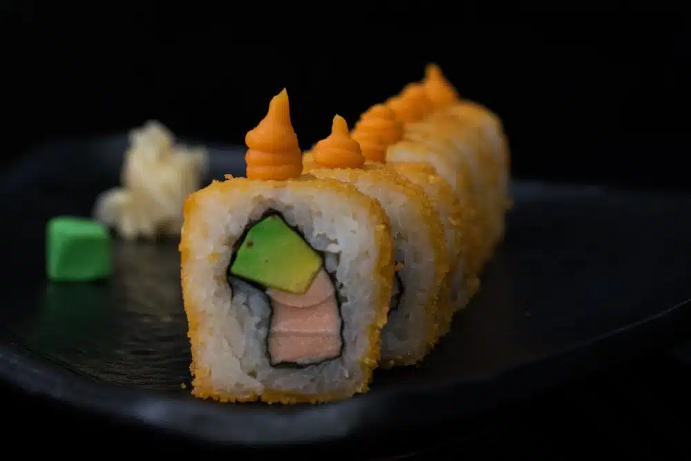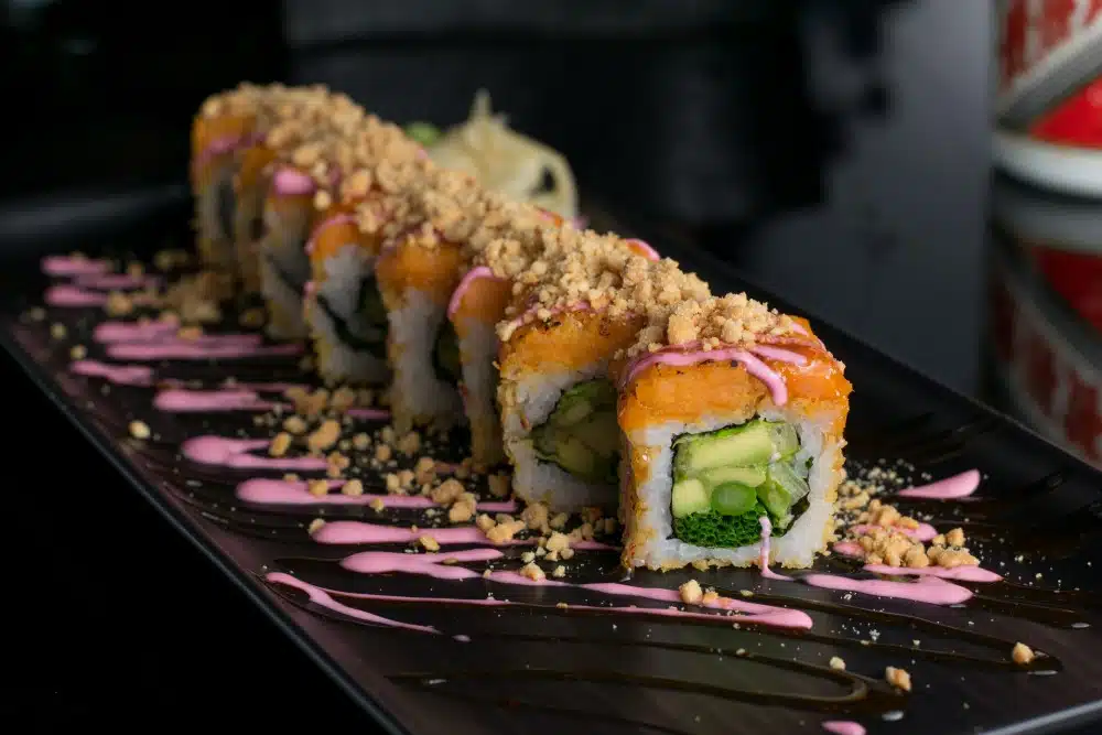 8 יחידות אין סייד אאוט במילוי גבינת שמנת אבוקדו גזר ובטטה עטוף בדף אורז ושבבי בטטה מטוגן בפאנקו. ברוטב ספייסי ויניגרט בעיטור פקאן סיני.