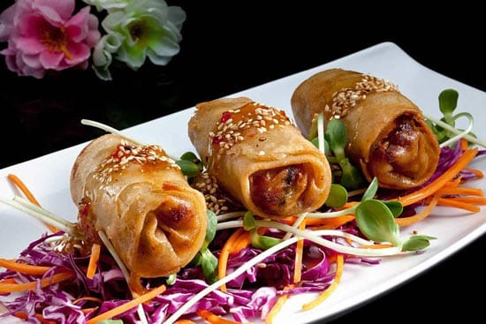 במילוי חזה עוף טחון עם גזר, כרוב ונבטים על מצע ירק עם רוטב צ'ילי חריף מתוק ושומשום (מכיל סויה וקורט רוטב פטריות)