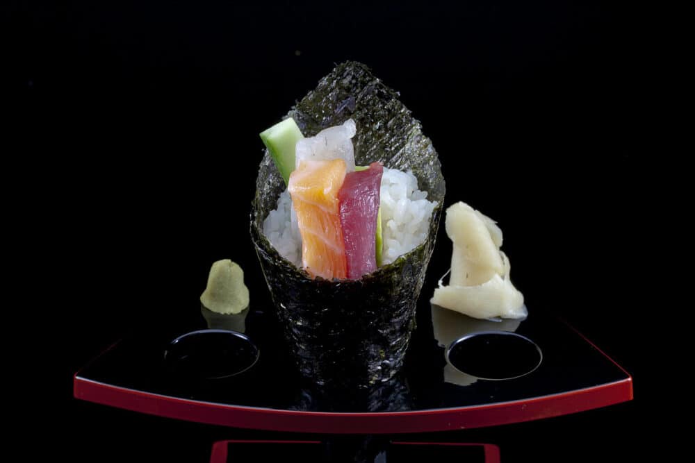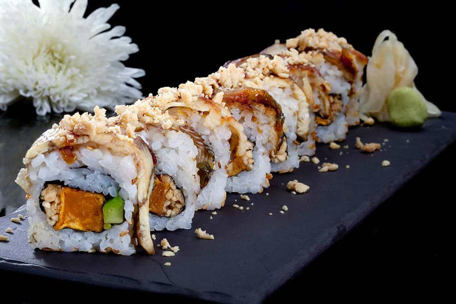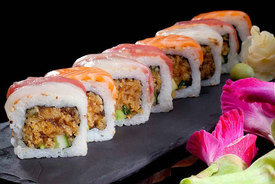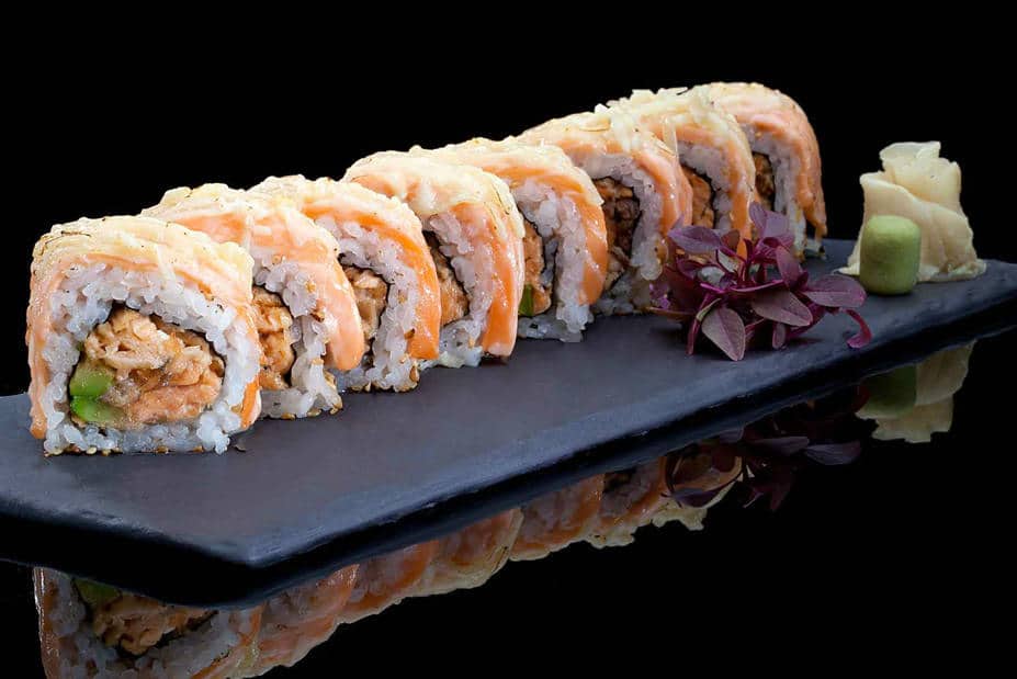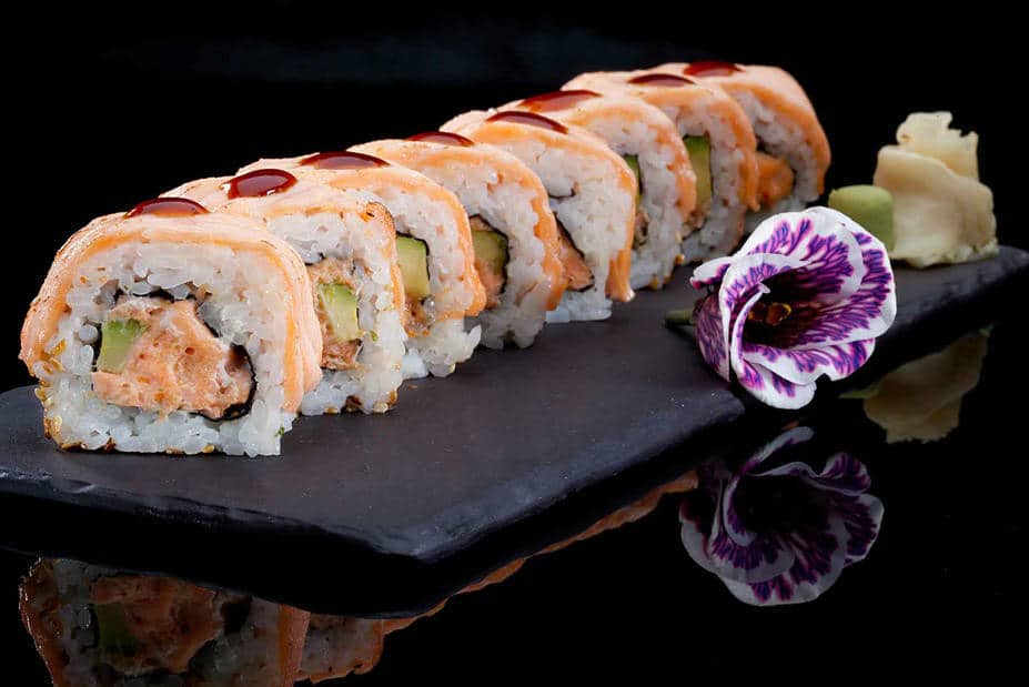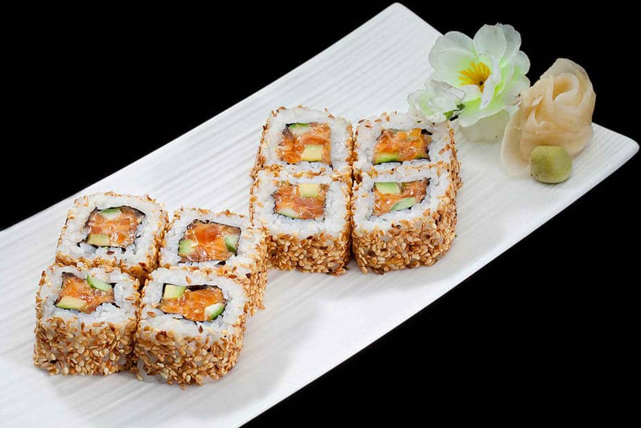 אין סייד אאוט במילוי סלמון קצוץ טרי, מיונז, רוטב ספייסי, אבוקדו ומלפפון בציפוי שומשום קלוי.