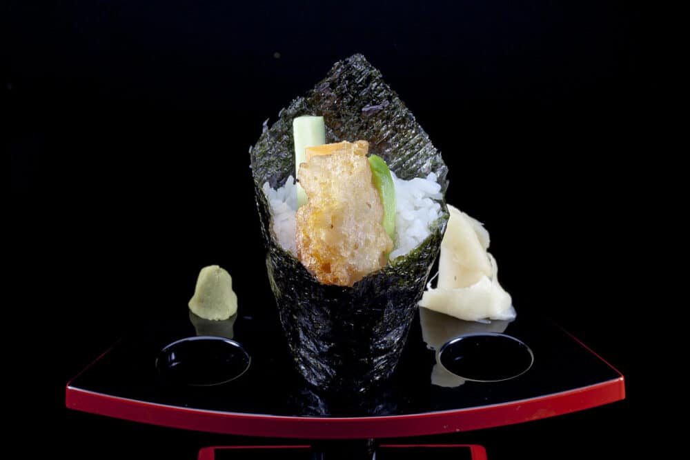 שרימפס בטמפורה קריספי, בטטה, אבוקדו ומלפפון.